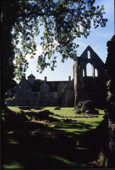 右端は南袖廊跡。正面の現在も使用されている建物はインファーマリー(施療院)であった部分。