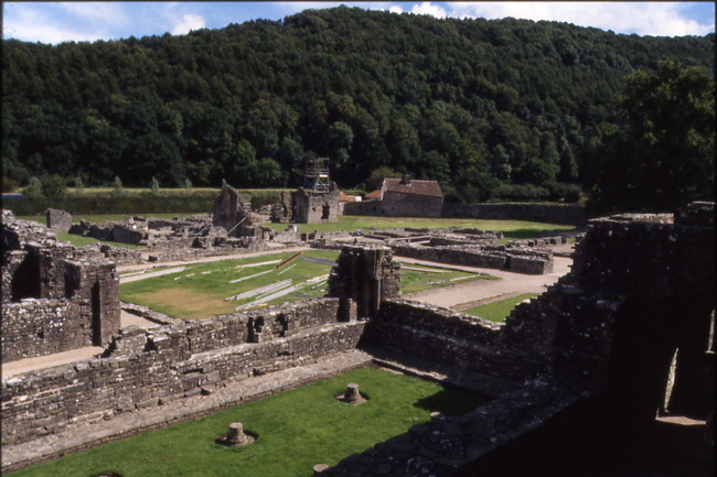 教会堂北側に広がる修道院の主要な建物跡。遺跡と丘陵の間をワイ川が流れる。