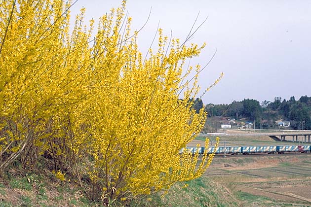 暖かな一日。Tシャツに着替えて花咲く丘から線路を見下ろした。